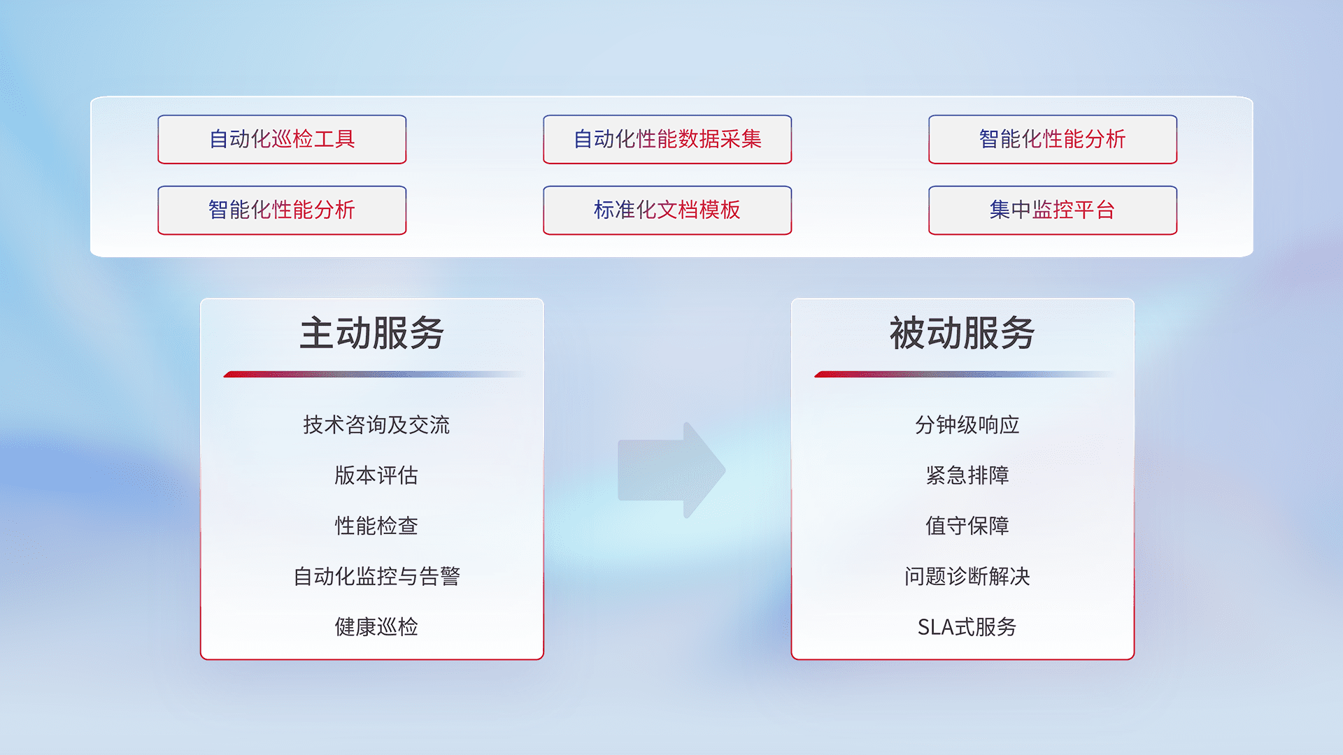 智能化工具和标准化文档,,,保障服务质量,,,,提供主动服务(包含技术咨询、、、、版本评估、、、、性能检查、、自动化监控与告警、、健康巡检)和被动服务包含(分钟级响应、、紧急排障、、、、值守保障、、、问题诊断解决、、、、SLA服务)。。。。